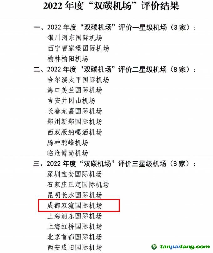 13日,中國民用機場協(xié)會發(fā)出通知,對2022年度“雙碳機場”評價結果進行公示。記者從公示中獲悉,此次全國共有19家機場獲2022年度“雙碳機場”評價一星級、二星級、三星級機場,其中成都雙流國際機場等8家機場被評價為三星級機場,為此次評價中等級最高的機場。