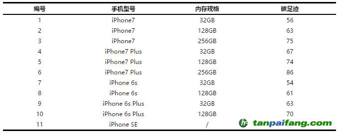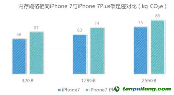 通過對(duì)比發(fā)現(xiàn),手機(jī)屏幕越大,耗能也相對(duì)較高,如:內(nèi)存規(guī)格相同時(shí),iPhone 7 Plus的碳足跡更高,如下圖所示。