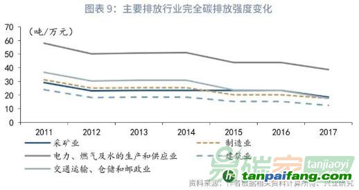 圖表9展示了碳排放強(qiáng)度較大的五個(gè)行業(yè)在2011年到2017年間的碳強(qiáng)度變化,均有一個(gè)下降的趨勢(shì),其中,2017年相較2011年完全碳排放強(qiáng)度下降較大的是交通運(yùn)輸、倉儲(chǔ)和郵政業(yè)以及建筑業(yè),分別下降了51.9%和47.3%,這可能和我國在此期間高鐵和電動(dòng)車的發(fā)展密切相關(guān)。各行業(yè)碳強(qiáng)度的下降折射出近年來我國各行業(yè)通過節(jié)能減排升級(jí)實(shí)現(xiàn)的二氧化碳減排成效。