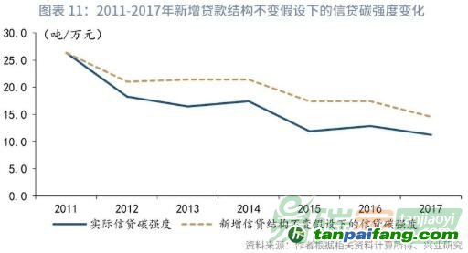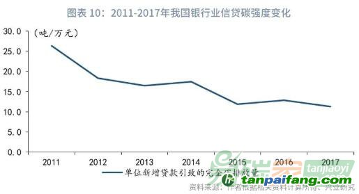 圖表10展示了我們測(cè)算的2011-2017年我國銀行業(yè)信貸碳強(qiáng)度結(jié)果,可以看到,短短6年間,我國銀行業(yè)信貸碳強(qiáng)度從2011年的26.3噸/萬元下降至了11.3噸/萬元,大幅下降了57.3%,而在此期間,我國的單位生產(chǎn)總值(GDP)二氧化碳排放量卻只下降了31.1%。也就是說,銀行信貸的碳排放強(qiáng)度比單位GDP碳排放強(qiáng)度,出現(xiàn)了更大比例的下降,由此折射出銀行業(yè)在推動(dòng)我國綠色低碳轉(zhuǎn)型發(fā)展、實(shí)現(xiàn)碳減排方面比經(jīng)濟(jì)整體結(jié)構(gòu)變化的步伐更快。