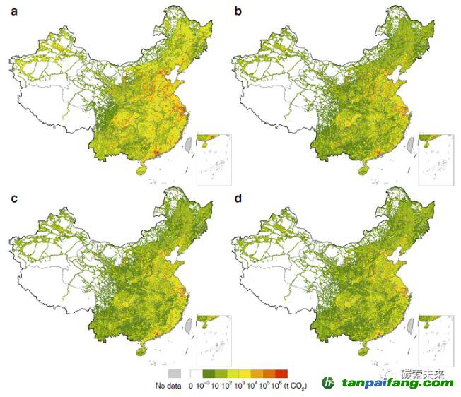 本文結(jié)合2012年中國(guó)碳排放的空間大數(shù)據(jù),同時(shí)考慮國(guó)內(nèi)省際及國(guó)際貿(mào)易,首次繪制了世界各國(guó)消費(fèi)層面通過(guò)國(guó)際貿(mào)易在中國(guó)產(chǎn)生的碳足跡高分辨率分布熱點(diǎn)地圖。研究表明,我國(guó)出口驅(qū)動(dòng)的碳足跡熱點(diǎn)主要集中在一些制造業(yè)中心地區(qū)(圖1a),包括長(zhǎng)三角(如上海)、珠三角(如東莞)和華北平原(如天津)等,這些城市均擁有或接近世界級(jí)的海運(yùn)港口,而大約1%的國(guó)土面積可容納75%的出口驅(qū)動(dòng)碳排放。