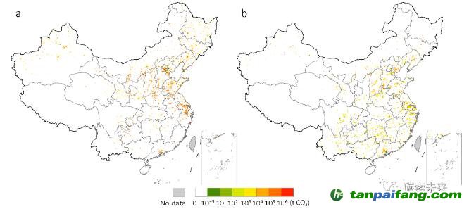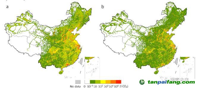 圖3 美國(guó)的家庭消費(fèi)(a)和資本形成(b)在中國(guó)的碳足跡熱點(diǎn)分布