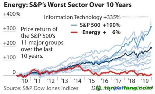 能源行業(yè)目前僅占該指數(shù)的4.3%,低于1980年代的25%,當(dāng)時(shí)石油和天然氣公司在前10大公司中占七家。如今,前10大公司中已經(jīng)沒(méi)有一家能源公司。能源行業(yè)領(lǐng)軍企業(yè)??松梨冢‥xxonMobil)在2019年跌出標(biāo)準(zhǔn)普爾的前10名,這是一百多年來(lái)以來(lái)的首次。