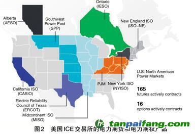 由于電力網(wǎng)絡(luò)及系統(tǒng)特有的復(fù)雜性,各個物理節(jié)點(diǎn)間供需不平衡導(dǎo)致整個網(wǎng)絡(luò)中電力價格存在差異,難以形成統(tǒng)一的電力價格而不利于電力期貨市場的發(fā)展。為解決此問題,美國PJM電力市場在所管轄的電網(wǎng)建立了若干交易中心節(jié)點(diǎn),對應(yīng)相關(guān)多個實(shí)際物理節(jié)點(diǎn)。該中心節(jié)點(diǎn)的電價是這些節(jié)點(diǎn)邊際電價(Locational Marginal Price,LMP)的加權(quán)平均,即中心節(jié)點(diǎn)的LMP是PJM電力市場的電價指數(shù),基于中心節(jié)點(diǎn)的LMP可開發(fā)出各類電力金融衍生品。如圖2所示,在美國洲際交易所(Intercontinental Exchange,ICE)可以購買到美國7大區(qū)域電力市場的165種電力期貨產(chǎn)品和15種電力期權(quán)產(chǎn)品。