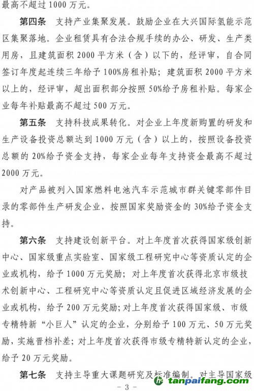 第四條支持企業(yè)聚集發(fā)展。鼓勵(lì)企業(yè)在大興國(guó)際氫能示范區(qū)集聚落地。企業(yè)租賃具有合法合規(guī)手續(xù)的辦公、研發(fā)、生產(chǎn)類用房,且建筑面積2000平米(含)以下的,經(jīng)評(píng)審,自合同簽訂年度起連續(xù)三年給予100%房租補(bǔ)貼;建筑面積2000平米以上的,經(jīng)評(píng)審,超出面積部分按照50%給予房租補(bǔ)貼。每家企業(yè)每年補(bǔ)貼最高不超過500萬元。 本+文`內(nèi)/容/來/自:中-國(guó)-碳-排-放-網(wǎng)-tan pai fang . com