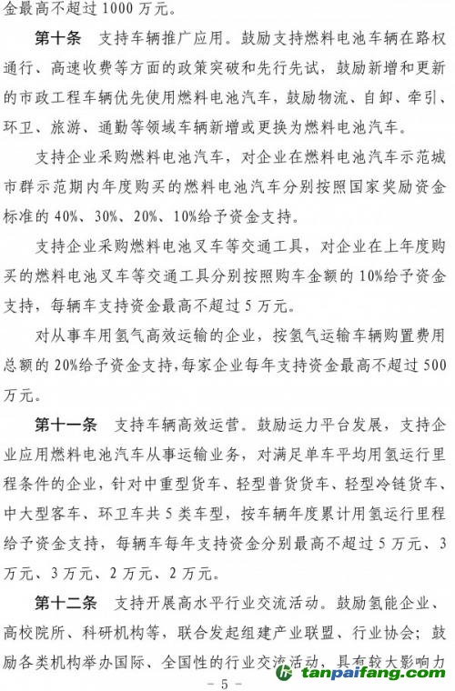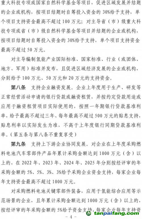 第九條支持上下游企業(yè)協(xié)同發(fā)展。對(duì)企業(yè)在上年度采購(gòu)燃料電池汽車零部件產(chǎn)品年累計(jì)采購(gòu)金額達(dá)到1000萬元(含)以上的,在2022年、2023年、2024年、2025年分別按經(jīng)評(píng)審的年采購(gòu)金額的5%、5%、3%、3%給予采購(gòu)企業(yè)資金支持,每家企業(yè)每年支持資金最高不超過1000萬元。 禸嫆@唻洎:狆國(guó)湠棑倣茭昜蛧 τāńpāīfāńɡ.cōm