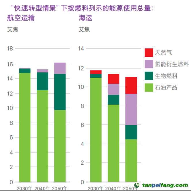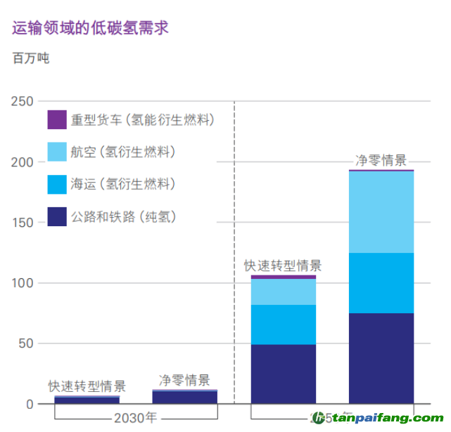 到2050年,在“快速轉(zhuǎn)型情景”和“凈零情景”里,這些氫衍生燃料占最終航空能源需求的10-30%,占海運行業(yè)終端能源用量的30-55%。其余大部分直接用于重型公路運輸。到2050年,在“快速轉(zhuǎn)型情景”和“凈零情景”里,低碳?xì)浜蜌溲苌剂险歼\輸行業(yè)最終總能耗的10-20%。 內(nèi)-容-來-自;中_國_碳_0排放¥交-易=網(wǎng) t an pa i fa ng . c om