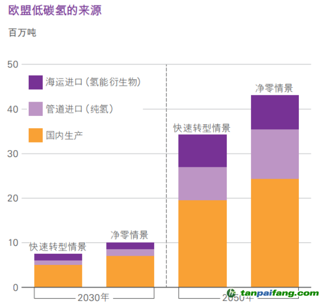 比如,到2030年,在“快速轉(zhuǎn)型情景”和“凈零情景”里,歐盟生產(chǎn)大約70%的自用低碳?xì)洌?050年這一比例將下降到60%左右。在歐盟進口的低碳?xì)渲?,大約一半是通過管道從北非和其他歐洲國家(挪威和英國)運輸?shù)募儦?;另一半以氫能衍生物的形式從全球市場通過海運進口。 本文+內(nèi)-容-來-自;中^國_碳+排.放_交^易=網(wǎng) t a n pa ifa ng .c om
